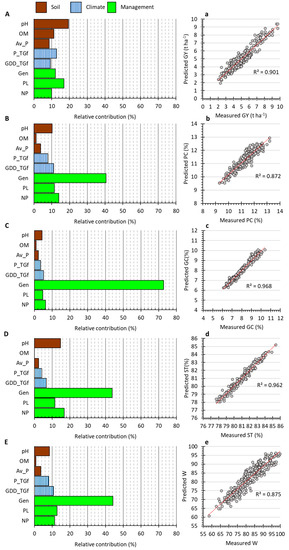 The GBRT model was applied to determine the relative contribution of soil, climate, and management parameters to grain yield, protein concentration, gluten concentration, starch concentration, and W (Figure 7). The relative contribution of soil and management factors to grain yield production was almost equal (39.15% and 38.85%, respectively), while climate contributed 22% to grain yield variability. The relative contribution of pH, PL, P_TGf, and Gen on grain yield was 18.4%, 16.84%, 12.75%, and 12%, respectively, with OM, NP, GDD_TGf, and Av_P contributing less than 12%. Moreover, management had a higher relative contribution to protein concentration and gluten concentration (65.96% and 83.8%, respectively) compared to soil and climate parameters (protein concentration, 81.9% and 15.95%, and gluten concentration, 8.6% and 7.52%, respectively). The Gen was the most influential factor for protein concentration and gluten concentration accumulation (relative contribution = 40.6% and 72.8%, respectively), with NP, PL, and GDD_TGf contributing 14%, 11.41%, and 11% to protein concentration, respectively. pH, P_TGf, Av_P, and OM showed contributions lower than 11% for protein concentration, while NP and GDD_TGf explained 6.3% and 5.14% of the gluten concentration, respectively, and PL, P_TGf, Av_P, OM, and pH had contributions lower than 5%. Likewise, management had the highest relative contribution to starch concentration and W variability (72.03% and 68.32%, respectively), compared to soil and climate parameters (ST, 17.02% and 11%; W, 13% and 18.17%). The Gen was the most influential parameter affecting starch concentration and W (relative contribution = 43.73% and 44.19%, respectively). The NP, pH, and PL contributed 16.75%, 14.68%, and 11.55% to starch concentration, respectively, while GDD_TGf, P_TGf, Av_P, and OM had contributions lower than 7%. W, PL, NP, and GDD_TGf explained 12.8%, 11.33%, and 10.6% of the variability, respectively, while P_TGf, Av_P, OM, and pH had contributions lower than 9%.