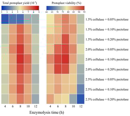 Figure 1. Effects of enzyme components on protoplast activity and yield of celery leaf protoplasts. Depending on the value, blue or red corresponds to a low or high value in the heatmap.