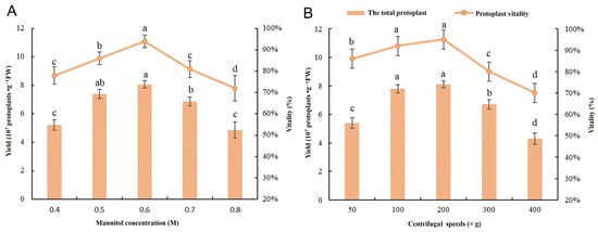 Figure 2. The yield of protoplasts from the protoplast isolation protocol under different mannitol concentrations (A) and centrifugation rates (B). The letters represent statistically significant differences at p ≤ 0.05.
