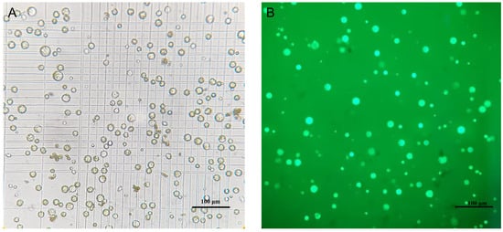 The protoplast yield was quantified using a dual-chamber hemocytometer under an Olympus CX21 optical microscope (Olympus, Tokyo, Japan). The calculation of protoplast yield involved dividing the number of protoplasts obtained in the enzyme solution by the fresh weight of the plant leaves utilized in the enzyme solution. Protoplast viability was assessed using fluorescein diacetate (FDA) staining [23]. A solution of FDA (5 mg·mL−1) was prepared by dissolving FDA in acetone. The isolated protoplasts were stained with FDA at 25 μL·mL−1 and incubated in the dark at room temperature for 20 min. Subsequently, the stained protoplasts were examined under a fluorescence microscope. Three random fields were selected for observation and photography, and each sampling was repeated three times. The number of fluorescent and total cells was counted to determine the protoplast viability rate. The protoplast viability rate was calculated by dividing the fluorescent protoplasts by the total number of protoplasts and multiplying the result by 100%.