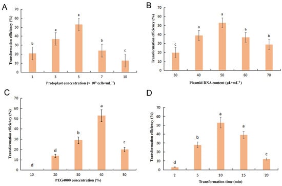 Figure 4. Transformation efficiency affected by protoplast concentration (A), plasmid DNA content (B), PEG4000 concentration (C) and transformation time (D). The letters represent statistically significant differences at p ≤ 0.05.