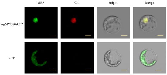 Celery leaf protoplasts were used to validate the transient expression system by examining the subcellular localization of AgMYB80. The results confirmed the expected outcome, as the co-expression of the GFP-MYB80 fusion protein in celery leaf protoplasts resulted in a distinct GFP signal specifically localized in the nucleus (Figure 5). In contrast, the reporter gene GFP was observed in all organelles, serving as a control. This validation confirms that the expression of celery leaf protoplasts is a reliable method suitable for subcellular localization analysis.