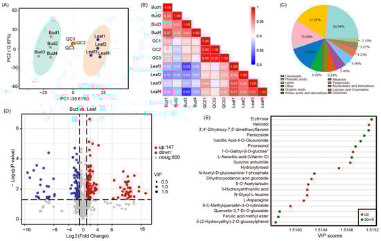 Differential chemotypes between the bud leaves and mature leaves of “Gaogai-1”. (A) Principal component analysis of metabolites identified from buds and leaves. Equal volumes of bud and mature leaf samples were mixed to generate a quality control (QC) sample. (B) Correlation analysis of bud and leaf samples. The color indicates the level of correlation of each sample, from low (blue) to high (red). (C) Pie chart depicting the categories of metabolites. (D) Volcano plots display differentially accumulated metabolites (DAMs) that were upregulated, downregulated, or showed no change between bud and leaf samples. (E) Top-enriched Kyoto Encyclopedia of Genes and Genomes (KEGG) terms.