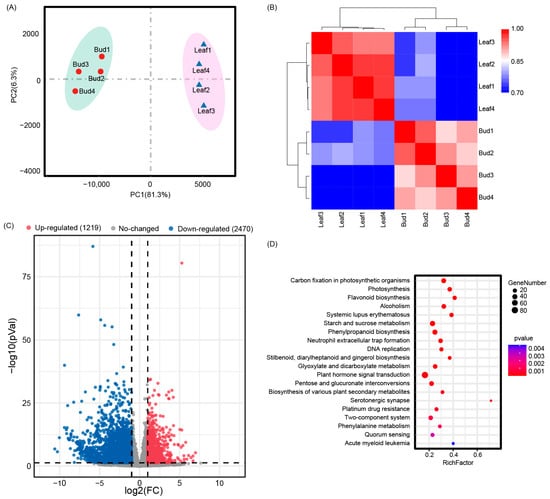 Differential phenotypes between Gaogai-1’ buds and leaves. (A) Principal component analysis of genes identified from buds and leaves. (B) Correlation analysis of bud and mature leaf samples. The color indicates the level of correlation of each sample, from low (blue) to high (red). The Z-score represents the correlation coefficient between each pair of samples. (C) Volcano plots and (D) top 20 KEGG pathways enriched in 3689 differentially expressed genes.