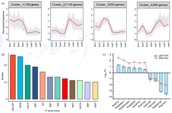 Gene expression and regulation during the development of “Gaogai-1” leaves. (A) Four clusters of differentially expressed genes. (B) Transcription factor families enriched in Clusters 1 and 2. (C) Relative expression of 10 genes in different tissues via qRT-PCR and RNA-seq.