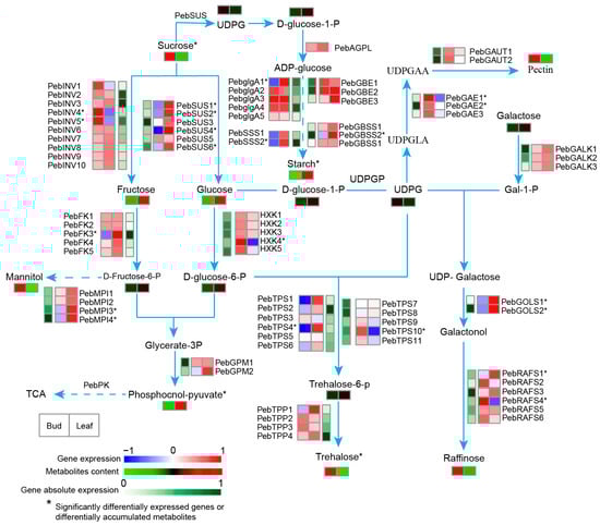 Simplified model of carbohydrate metabolic pathway in “Gaogai-1” and the heatmap of metabolite accumulation and related gene expression pattern at different developmental stages. The differentially expressed genes and differentially accumulated metabolites are marked with asterisks.
