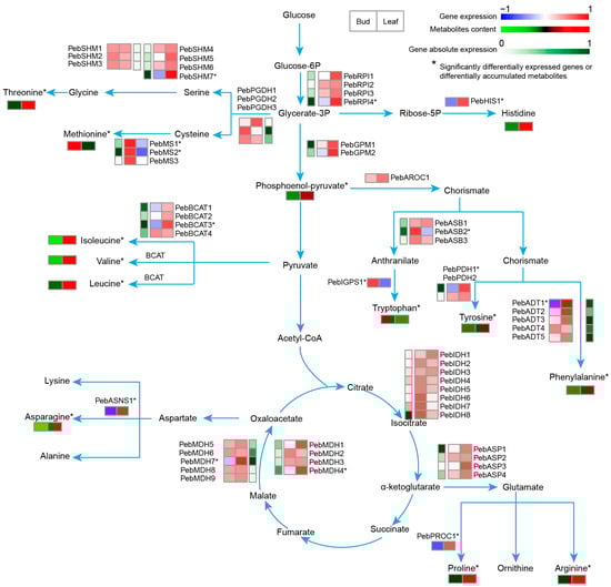 Simplified model of amino acid metabolic pathways in “Gaogai-1” and the heatmap of metabolite accumulation and related gene expression patterns at different developmental stages. The differentially expressed genes and differentially accumulated metabolites are marked with asterisks.