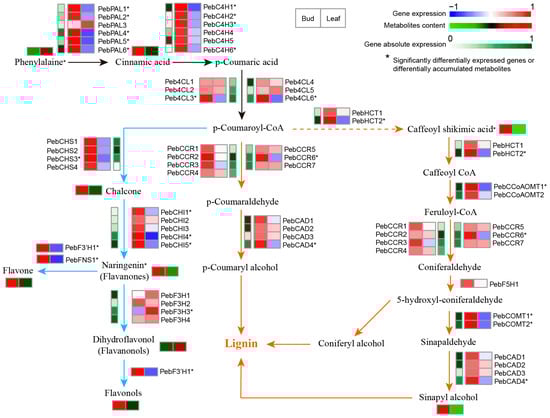 Flavonoids are synthesized through the phenylpropanoid pathway, which uses phenylalanine as a substrate [31]. The phenylalanine content and the expression level of the highly expressed phenylalanine biosynthesis gene PebADT1 increased in the mature leaves (Figure 6). However, the content of downstream products of phenylalanine metabolism, e.g., flavonoids, lignin, and salicylic acid, decreased content (Figure S6; Table S6). In these pathways, PebPALs encode the key gateway enzyme phenylalanine ammonia lyases. Decreasingly accumulated metabolites were determined by downregulating these genes. Similarly, the expression of nearly all downstream genes decreased, including five of six Peb4CLs, three of four PebF3H, and all PebC4Hs, PebCHSs, PebCHIs, PebF3′Hs, and PebFNS (Figure 7). However, the content of the deviates, such as L-Dopa and glycyl-L-phenylalanine, increased (Table S2; Figure S6). By combining the co-expression network and cis-element binding ability prediction, we identified some important TFs, which include HD-ZIP, MYB, GRF, and WRKY families (Figure S5C; Table S4). All these predicted TFs (64) belong to cluster 1 (65.6%) and cluster 2 (34.4%) (Table S5).