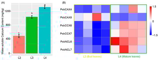 (A) Water-soluble calcium content of the second to fourth pairs of leaves. (B) Heatmap of transcript accumulation patterns (relative expression) of six differentially expressed calcium antiporter genes generated by RNA-seq. Scaled log2 expression values (FPKM) are shown in the heatmap legend. Different lowercase letters indicated significant differences at 0.05 level.