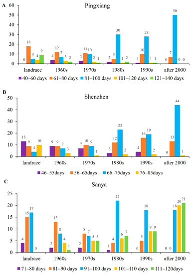The timing of heading in rice plants, i.e., early or late, can affect the accumulation of photosynthetic products in rice, and then affect the grain filling process in the rice filling stage, and ultimately affect the yield and quality of rice. The heading stage of rice also determines the adaptability and yield of rice varieties in different regions, making it one of the main target traits for artificial selection [31,32,33]. In this study, various varieties across different breeding stages displayed variations in heading time under diverse ecological conditions, and a trend towards a concentrated distribution began to emerge from the 1980s. This may be attributed to breeders developing early and late season double-cropping rice varieties that can be used for both early and late cropping. Prior to the 1970s, rice varieties in the double-cropping areas of South China were categorized as early or late rice. If early rice varieties were used for late season planting, their growth duration would be significantly shortened, resulting in early heading and a significant decrease in yield. Late rice varieties used for early planting would typically delay head or failure to head, resulting in reduced yield or even no harvest. Such materials were highly light and temperature sensitive, with high requirements for light conditions and poor adaptability to the environment, leading to their scattered distributions in different environments. In 1978, with the development of the first dual-purpose rice variety in South China, i.e., Guichao 2, a large number of early and late season double-cropping rice varieties with low light sensitivity and moderate temperature sensitivity were subsequently bred. This reduced their susceptibility to environmental and seasonal influences, ensured a moderate growth duration, and improved the adaptability of the varieties.