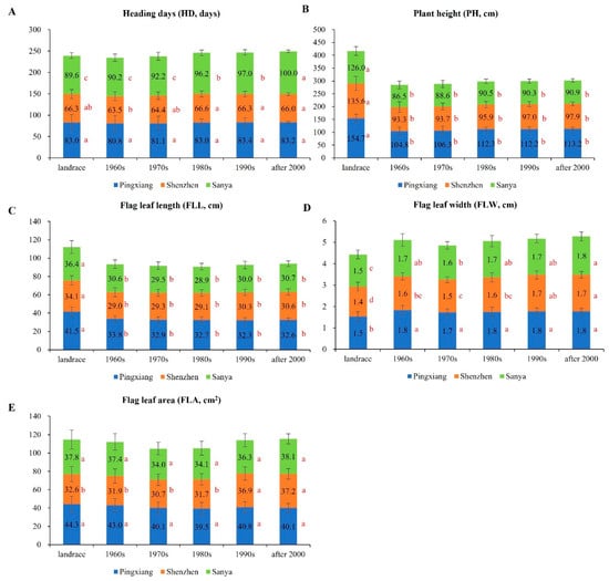 Heading days and plant architecture traits of rice at different breeding stages under different environments. Different letters next to the bar chart denote significant differences among decades by Duncan’s multiple range test within each location. (A) heading days; (B) plant height; (C) flag leaf length; (D) flag leaf width; (E) flag leaf area.