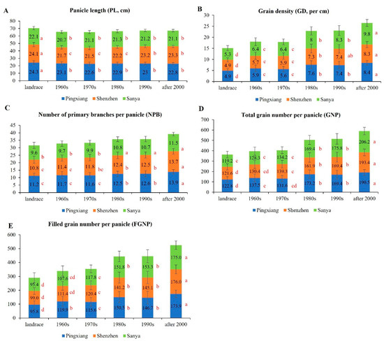 Panicle type-related traits of rice at different breeding stages under different environments. Different letters next to the bar chart denote significant differences among decades by Duncan’s multiple range test within each location. (A) panicle length; (B) grain density; (C) number of primary branches per panicle; (D) total grain number per panicle; (E) filled grain number per panicle.