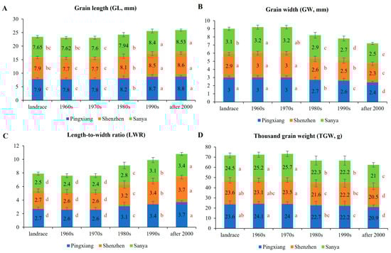 Grain type characteristics of rice at different breeding stages under different environments. Different letters next to the bar chart denote significant differences among decades by Duncan’s multiple range test within each location. (A) grain length; (B) grain width; (C) grain length-to-width ratio; (D) Thousand grain weight.