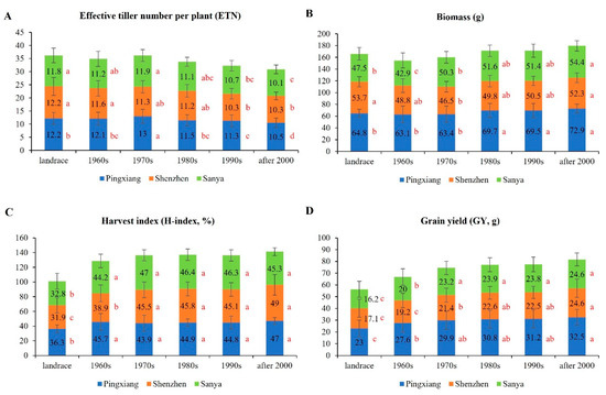 Yield characteristics of rice at different breeding stages under different environments. Different letters next to the bar chart denote significant differences among decades by Duncan’s multiple range test within each location. (A) effective tiller number per plant; (B) biomass per plant; (C) harvest index; (D) grain yield per plant.