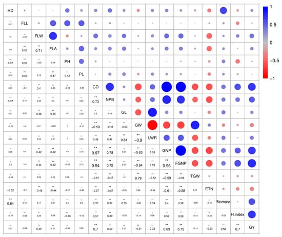 Correlation coefficients among 18 main agronomic traits. The data were derived from the average phenotype of each trait across three different locations. FLL, flag leaf length; FLA, flag leaf area; PL, panicle length; FLW, flag leaf width; HD, heading date; NPB, number of primary branches per panicle; GNP, total grain number per panicle; GY, grain yield per plant; FGNP, filled grain number per panicle; GL, grain length; GD, grain density; H-index, harvest index; LWR, length-to-width ratio; ETN, effective tiller number per plant; GW, grain width; TGW, thousand grain weight; PH, plant height. * and ** denote significant difference at p < 5% and p < 1% levels, respectively.