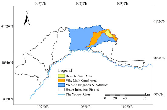 The HID (40°20′~41°18′ N, 106°20′~109°20′ E) is located in the upstream of the Yellow River Basin which is primarily focused on agriculture (Figure 1). The region has a typical arid and semiarid continental climate, with an average annual maximum temperature of 27.19 °C and a minimum temperature of −14.40 °C, occurring in July and January, respectively. The annual average precipitation is approximately 146.65 mm, with more than 70% occurring from July to September, and the pan evaporation is 2280 mm. The HID mainly depends on the water diverted from the Yellow River to irrigate crops, and the average annual water diversion is approximately 3.743 to 5.203 billion m3 per year. The area of the HID is about 11,073 km2, with an irrigated area of 5740 km2 that diverting water to irrigate from the Yellow River. This study divided the HID into four scales; except for the HID, the other three scales were the Yichang Irrigation Subdistrict (YCIS), the Yihe Main Canal Area (YHMC), and the Branch Canal Area (BC). The respective areas are 3321.05 km2, 667.3 km2, and 121 km2.