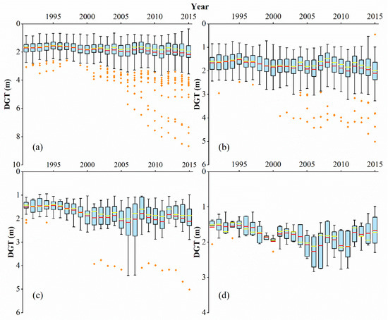 Variation characteristics of annual average DGT in the HID at different scales: (a) irrigation district scale, (b) irrigation subdistrict scale, (c) main canal scale, and (d) branch canal scale. The yellow line represents the median, the red line represents the mean, and the scattered dots represent the outliers.