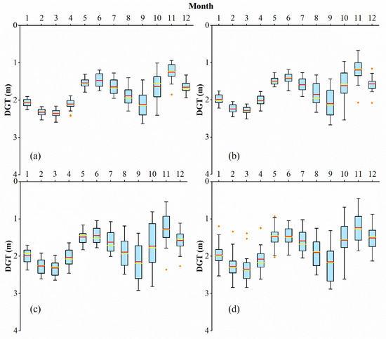 Variation characteristics of monthly average DGT in the HID at different scales: (a) irrigation district scale, (b) irrigation subdistrict scale, (c) main canal scale, and (d) branch canal scale. The yellow line represents the median, the red line represents the mean, and the scattered dots represent the outliers.