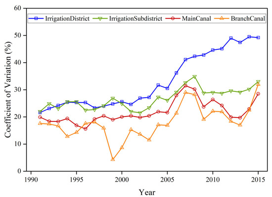 Since 1999, in order to improve the utilization rate of water resources, the HID had implemented water-saving projects (WSPs), such as lining canals, leveling farmlands, changing planting structures, etc. [21]. Considering the impact of the application of WSPs on the temporal variability of DGT, this study took 2000 as the time node and explored the changing patterns of the temporal variation coefficients at different scales before and after the implementation of WSPs. First, the time periods were divided into five segments: 1991–1995, 1991–2000, 2001–2005, 2001–2010, and 2001–2015. In each time segment (including before and after the application of WSPs), the spatial scales and monthly variation coefficients were negatively correlated as shown in Table 1. Before the application of WSPs, the variation coefficients of the irrigation district, main canal, and branch canal all decreased with the increase in the time series, while the variation coefficient of the HID kept stable. However, after the implementation of WSPs, the coefficients at the four spatial scales all significantly increased with the increase in the time series, and the smaller the spatial scale was, the more obvious the increase in the variation coefficient.