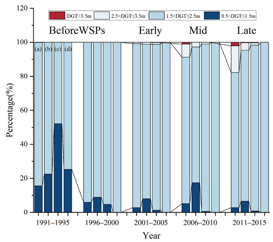 The spatial interpolation of DGT in the HID was carried out by using the inverse distance interpolation method with a 5-year interval as shown in Figure 5. The results showed that change in the DGT ranged from 0.7 to 3.1 m in the study area, and the spatial distribution of DGT in the HID was deeper in the north and south and shallower in the middle, showing tremendous regional variability. Although there was a slight recovery trend of DGT in some regions from 2006 to 2010, it was still unable to regain the depth before 2000. The areas with deeper DGT increased significantly over time. Furthermore, to explore the differences in DGT at different spatial scales, the area ratio occupied by DGT in four ranges were also calculated shown in Figure 6. According to the variation in DGT in the HID, it was divided into four levels: 0.5 < DGT ≤ 1.5 m, 1.5 < DGT ≤ 2.5 m, 2.5 < DGT ≤ 3.5 m, and >3.5 m, representing shallow, moderate, deep, and extremely deep depths, respectively. The period from 1991 to 2000 was taken as the period before the application of WSPs, and every 5a thereafter was taken as the period after the application of WSPs; respectively, the initial stage (2001–2005), the middle stage (2006–2010) and the late stage (2011–2015). For four periods, the area ratio occupied by DGT in the 1.5–2.5 m range was the largest, accounting for 94.11%, 96.40%, 86.13%, and 79.43%, respectively, showing first increase and then decrease. This indicated that the change in the DGT in the HID mainly ranged from 1.5 to 2.5 m, which was beneficial to control the soil salinization. The ratio of depths in the 0.5–1.5 m range decreased over time, from 5.86% to 2.78%. Meanwhile, the areas occupied by depths in the 2.5 < DGT ≤ 3.5 m and >3.5 m ranges increased annually, the former increased from 0.03% to 15.66% and the latter only appeared after the application of WSPs, accounting for 0.02%, 1.04% and 2.13%.