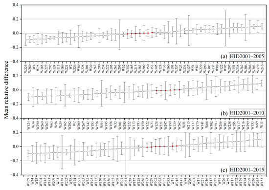 MRD of monitoring wells in the HID (a) from 2001 to 2005, (b) from 2001 to 2010 and (c) from 2001 to 2015, the error line represents SDRD, and red points are wells with stability.