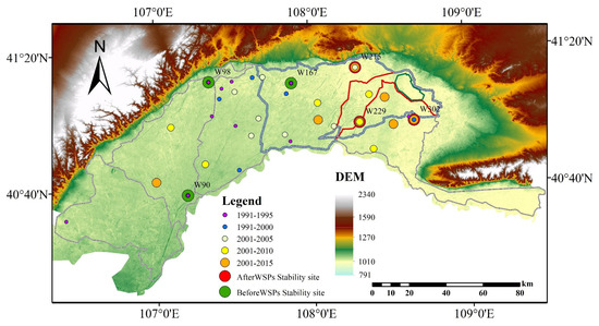 The results showed that the stability sites before and after the application of WSPs were not entirely the same as those obtained from 1991 to 2015. In addition, the stability sites appeared with different frequencies for three temporal scales (15-year, 10-year, and 5-year). Before the implementation of WSPs, the stability sites were W90, W98, W167, W229, and W302 (Figure 8). After the implementation of WSPs, especially at the 15-year scale, the stability sites were W193, W229, W302, W222, W267, W51, and W215 (Figure 9c). W229 and W302 also occurred at 10-year and 5-year scales as stability sites (Figure 9a,b). It can be inferred that both W229 and W302 showed good temporal stability at a long-term scale before and after the application of WSPs.