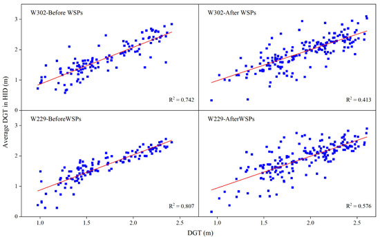 To determine whether representative sites can accurately estimate the average DGT in the HID, the DGT of representative wells measured before and after the implementation of WSPs were compared with the average DGT of all observation wells in the HID. As shown in Figure 11, the correlation between the DGT of stability sites before and after the application of WSPs and the average DGT in the HID was compared. The results showed that the representativeness of the stability sites was affected after implementing WSPs, and the correlation was significantly reduced, but they were still representative. As mentioned, the stability sites were W229 and W302, but after implementing WSPs, W229 had an advantage in representativeness. The DGT of well W229 fluctuated near the average value, but the R2 value after implementing WSPs was only 0.576. It also indicated that the application-of-WSPs process will have a significant impact on the DGT of different wells, especially the stability sites. Compared to the average DGT of W229 and the regional average values before and after the application of WSPs, the errors were approximately 0.015 m/m and 0.013 m/m, respectively. Although the stability sites that only occurred before implementing WSPs such as W90 and W167, showed good correlation, which R2 were 0.769 and 0.615, their fitting results after the application of WSPs were much lower than the other stability sites mentioned above. This also indicated that the other stability sites can still maintain their stability advantage even when they are interfered with external factors.