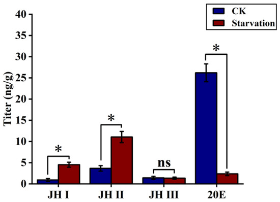 The JH and 20E titres of fourth-instar larvae after 24 h of starvation and under adequate food conditions (CK). Data shown in the figures are means ± standard errors. With significantly expression differences between different treatment groups and control groups are indicated using asterisks: * p < 0.05; ns represents no significant difference (independent sample t-test).