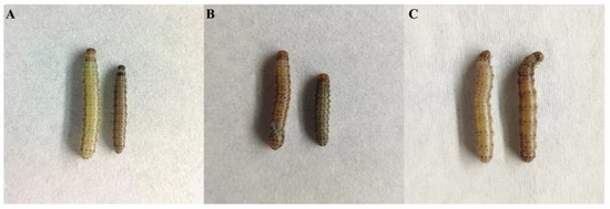 (A): The end of the penultimate stage; (B): The beginning of the last stage; (C): The last stage; starvation treatment on the left and normal feeding on the right.