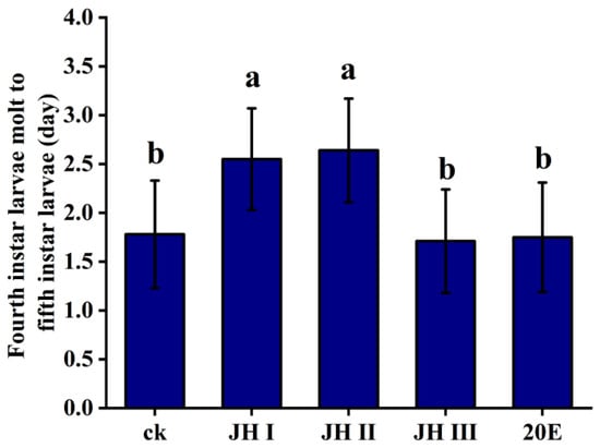 Time from moulting to the next instar of the fourth-instar larvae after the injection of JH and 20E. The data shown in the figures are means ± standard errors. The averages within the columns followed by the same letter do not significantly differ according to Tukey’s multiple range test (α = 0.05).