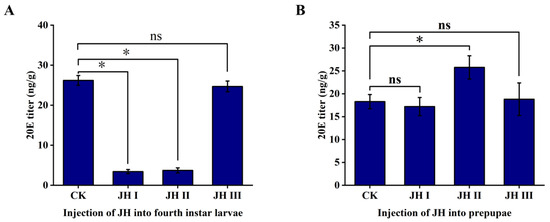(A): The effect of injection of JH into 4th instar larvae on the titer of 20E. (B): The effect of injection of JH into prepupae on the titer of 20E. The data shown in the figures are means ± standard errors. The significant expression differences between the different treatment groups and control groups are indicated using asterisks: * p < 0.05; ns represents no significant difference (independent sample t-test).
