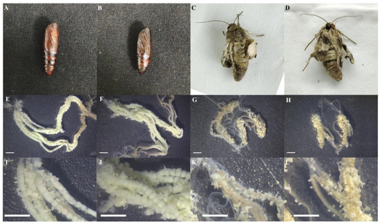 (A): Solvent control group; (B): pupae with eclosion failure; (C): burrowing the back surface of a failed adult pupa shell; (D): burrowing the ventral surface of a failed adult pupa shell; (E): JH I treatment of emerging adult ovaries; (F): JH II treatment of emerging adult ovaries (G): JH III treatment of emerging adult ovaries; (H): CK treatment of emerging adult ovaries. (I–L) The local magnification of the ovaries of (E–H), respectively, with the white line segments representing 2 mM in length.
