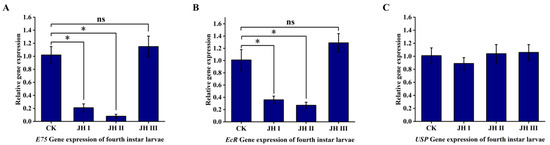 (A): The effect of injection of JH into fourth instar larvae on the expression of E75 gene. (B): The effect of injection of JH into fourth instar larvae on the expression of EcR gene. (C): The effect of injection of JH into fourth instar larvae on the expression of USP gene. Data shown in the figures are means ± standard errors. With significantly expression differences between different treatment groups and control groups are indicated using asterisks: * p < 0.05; ns represents no significant difference (independent sample t-test).