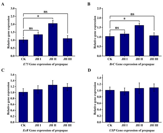 (A): The effect of injection of JH into prepuae on the expression of E75 gene; (B): The effect of injection of JH into prepuae on the expression of BrC gene; (C): The effect of injection of JH into prepuae on the expression of EcR gene; (D): The effect of injection of JH into prepuae on the expression of USP gene. The data shown in the figures are means ± standard errors. The significant expression differences between the different treatment groups and control groups are indicated using asterisks: * p < 0.05; ns represents no significant difference (independent sample t-test).