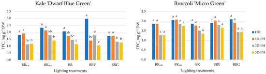 The total phenolic content (TPC) in kale and broccoli microgreens under different lighting treatments on harvest day and during post-harvest storage. BR638—blue (B, peak = 447 nm) and red (R638, peak = 638 nm); BR665—blue and red (R665, peak = 665 nm); BR—blue and red (R, peaks = 638 and 665 nm); BRV—blue, red, and violet (V, peak = 405 nm); BRG—blue, red, and green (G, peak = 520 nm); HD—harvest day; 1D-PH—one day after the harvest; 3D-PH—three days after the harvest; 5D-PH—five days after the harvest; DW—dry weight. Means with different letters significantly differ from the control (HD) at p < 0.05.