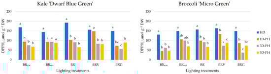 The DPPH free radical scavenging activity in microgreens under different lighting treatments on harvest day and during post-harvest storage. BR638—blue (B, peak = 447 nm) and red (R638, peak = 638 nm); BR665—blue and red (R665, peak = 665 nm); BR—blue and red (R, peaks = 638 and 665 nm); BRV—blue, red, and violet (V, peak = 405 nm); BRG—blue, red, and green (G, peak = 520 nm); HD—harvest day; 1D-PH—one day after the harvest; 3D-PH—three days after the harvest; 5D-PH—five days after the harvest; DW—dry weight. Means with different letters significantly differ from the average at p < 0.05.