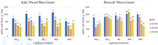 The highest ABTS free radical activity was determined in the kale and broccoli microgreens under the BRV treatment on HD (Figure 3). However, it did not significantly differ from the antiradical activity after one day of post-harvest storage (1D-PH). In addition, no significant differences in the ABTS free radical scavenging activity on HD and 1D-PH in broccoli under all lighting treatments or in kale under the BR638 and BRG lighting treatments were determined. A significant decrease (about 32% and 37%) in the ABTS free radical scavenging activity was observed in the kale at 1D-PH under the BR665 and BR treatments, respectively. The BR638, BRV, and BRG lighting treatments led to a decrease in the ABTS free radical activity starting at 3D-PH, and a lower antiradical activity by 45%, 41%, and 47%, respectively, at 5D-PH. No significant changes in the ABTS free radical scavenging activity were observed in the broccoli under the BR638, BR665, and BR lighting treatments on HD and during post-harvest storage. As in the kale, the BRG led to significantly lower ABTS free radical scavenging activity in the broccoli at 3D-PH and 5D-PH (42% and 51%, respectively).