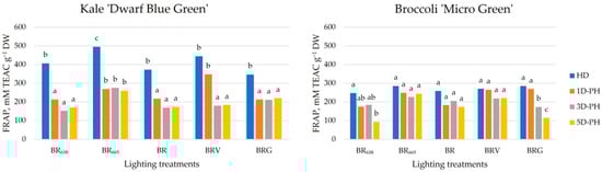 On HD, the highest ferric-reducing antioxidant power (FRAP) was determined in the kale microgreens under the BR665 lighting treatment (Figure 4). However, it decreased by an average of 49% from 1D-PH to 5D-PH. A similar trend in the FRAP decrement in kale under other lighting treatments was observed, except for BRV, when the FRAP at 1D-PH did not significantly differ compared to HD. As in kale, the highest FRAP was measured in the broccoli under the BR665 treatment, and no significant changes were observed during post-harvest storage. Also, the same trend was observed in the broccoli under the BR and BRV lighting treatments. The BRG treatment led to a significant decrease in the FRAP at 3D-PH and 5D-PH (by 39% and 60%, respectively).