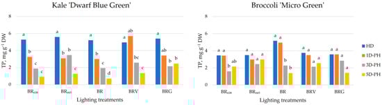 The total protein content (TP) in microgreens under different lighting treatments on harvest day and during post-harvest storage. BR638—blue (B, peak = 447 nm), red (R638, peak = 638 nm); BR665—blue and red (R665, peak = 665 nm); BR—blue and red (R, peaks = 638 and 665 nm); BRV—blue, red, and violet (V, peak = 405 nm); BRG—blue, red, and green (G, peak = 520 nm); HD—harvest day; 1D-PH—one day after the harvest; 3D-PH—three days after the harvest; 5D-PH—five days after the harvest; DW—dry weight. Means with different letters significantly differ from the control (HD) at p < 0.05.