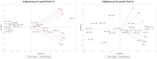 The principal component analysis (PCA) results for the factor loadings, scores, and eigenvalues for the first two principal components (F1 and F2) are presented in Table S3. The PCA showed that the antioxidant capacity according to the FRAP, the ABTS and DPPH free radical activities, and the TP in kale (Figure 6, A Biplot) was associated with the BR665, BR, and BRG lighting treatments on HD and with the BRV lighting treatment at 1D-PH. Also, the TPC, CHL, and CAR were associated with the BRV treatment at HD, with the BR638 and BR665 treatments at 1D-PH, and with the BR665 lighting treatment at 3D-PH. In broccoli, the antioxidant capacity was associated with the BR665, BRV, and BRG treatments at HD and with the BR665 lighting treatment at 3D-PH (Figure 6, B Biplot). The contents of the total protein, phenolic compounds, and photosynthetic pigments (CHL and CAR) were associated with the BR638 and BR treatments at HD, the BR665, BR, BRV, and BRG treatments at 1D-PH, and the BR665 lighting treatment at 5D-PH.