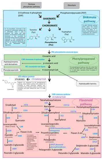 The aromatic amino acid phenylalanine (C9H11NO2) is biosynthesized via the shikimate pathway that joins carbohydrate metabolism with the biosynthesis of secondary metabolites; all phenolic compounds are synthesized from this amino acid [43] (or from tyrosine, such as resveratrol [107]). The rate-limiting enzyme [108] of phenylpropanoid biosynthesis is the phenylalanine ammonia-lyase (PAL) which orders the flux through this pathway. Phe is converted to p-coumaroyl-CoA by PAL, C4H, and 4CL. The entry of p-coumaroyl-CoA (C30H42N7O18P3S) into the flavonoid biosynthesis pathway depicts the beginning of the synthesis of specific flavonoids; in fact, two major categories of compounds can be engendered (i.e., flavonoids by the CHS, chalcone synthase or naringenin-chalcone synthase enzyme and stilbenes by the STS, stilbene synthase enzyme) [109]. Flavonoid compounds arise from 4,2′,4′,6′ tetrahydroxychalcone (naringenin chalcone; C15H12O5). The dihydroflavonols DHK (dihydrokaempferol or aromodendrin), DHQ (dihydroquercetin or taxifolin), and DHM (dihydromyricetin or ampelopsin) are, respectively, changed into the flavonols kaempferol (C15H10O6), quercetin (C15H10O7), and myricetin (C15H10O8) by the flavonol synthase enzyme (FLS) [48]. The flavonoid pathway leads to the synthesis of different classes of metabolites such as flavan-3-ols, flavonols, procyanidins, and anthocyanidins. DFR (dihydroflavonol reductase), a NADPH-dependent reductase, is the significant enzyme in the anthocyanidin and proanthocyanidin pathway by forming a hydroxyl group at position C4 of ring C [110]. The flavan-3,4-ols (leucoanthocyanidins or flavan-diols) derive from reduction in dihydroflavonols [111] catalyzed by dihydroflavonol reductase; leucopelargonidin is generated from DHK, leucocyanidin is generated from DHQ, and leucodelphinidin is generated from DHM [112]. They are anthocyanidin and proanthocyanidin precursors [113]. The leucoanthocyanidin (leucocyanidin, leucopelargonidin, and leucodelphinidin) are colorless; during their pathway with the catalysis of ANS (anthocyanidin synthase), also called leucoanthocyanidin dioxygenase; LDOX), they are turned into the following colored anthocyanidins: cyanidin, pelargonidin, and delphinidin [113,114]. UFGT (UDP-glucose flavonoid 3-glucosyltransferase) turns into cyanidin-3-glucoside (C21H21O11; known as chrysanthemin), pelargonidin-3-glucoside (C21H21O10; known as callistephin), and delphinidin-3-glucoside (C21H21O12; known as myrtillin) the unstable anthocyanidins [115].