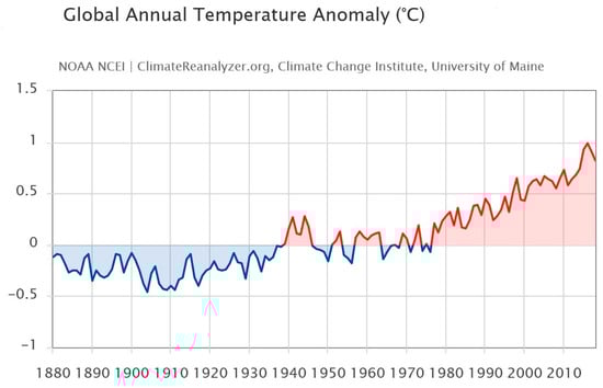 Global warming alludes to long-term variations in the climate of Earth affected by warmth imbalances from natural origin (e.g., volcanic, solar, or internal dynamics) and anthropogenic sources (e.g., greenhouse gas ejections and soil management) [116,117,118]. Below is an image to highlight and underline how the global temperature is undergoing a change (Figure 3).