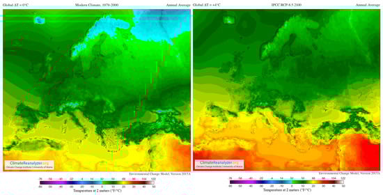 Images from Birkel, S.D. ‘Environmental Change Model’, Climate Reanalyzer (https://ClimateReanalyzer.org), Climate Change Institute, University of Maine, USA. Accessed on 22 June 2023. In the Environmental Change Model (ECM), solutions are calculated from gridded inputs of monthly temperature and precipitation using a degree day solver and biome rubric. Boundary conditions for a given experiment are derived by blending reanalysis (modern climate) and general circulation model (future climate) climatologies. The ratio of reanalysis to the future climate depends on a user-selected global temperature departure value, ∆T. For the modern climate, ∆T = 0 °C; for 2100, ∆T = +4 °C (European model) [119].