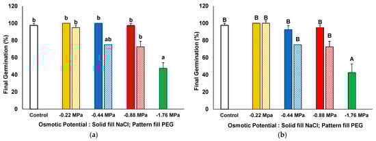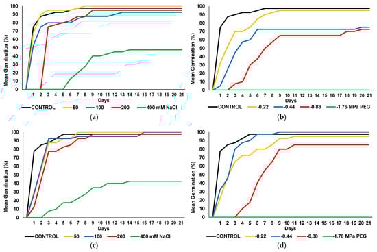 Seeds were placed in standard 90 mm diameter Petri dishes on two disks of filter paper moistened with 2.5 mL of distilled water for the control treatment or with increasing concentrations of NaCl or PEG 6000 (Polyethylene Glycol) for the stress treatments. Controls and treated seeds were covered with two other filter paper disks moistened with the same amount of distilled water or the respective stress treatment solutions. The germination assays were carried out with four replications per treatment and species, with ten seeds in each plate. The salt concentrations tested were 50, 100, 200 and 400 mM NaCl in aqueous solutions, and the corresponding iso-osmotic PEG concentrations ensuring osmotic potentials of −22, −44, −88, and −1.76 MPa, calculated by applying the Van’t Hoff equation [40]. Germination was performed in an EQUiTEC germination chamber (LAF Technologies, Bayswater North, VIC, Australia) at 30 °C for 16 h and at 20 °C for 8 h, with a relative humidity of 65%.