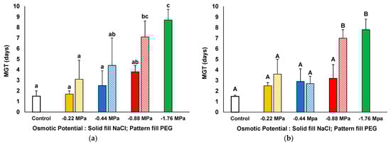 Figure 3. Mean germination time (MGT) in I. purpurea (a) and I. tricolor (b) after 21 days of treatment with increasing iso-osmotic concentrations of NaCl and PEG. Control: germination in distilled water. The values plotted are the means ± SE (n = 4). Different lowercase and uppercase letters within the bars indicate significant differences between treatments, for each species, according to the Tukey post hoc test (p < 0.05). For both species, no germination was observed for PEG treatments equivalent to −1.79 MPa; thus, no MGT is measured and plotted for this condition.
