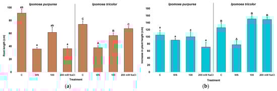 Figure 4. Root length (a) and increase in stem length (b) after three weeks of treatment in the two Ipomoea species. The values plotted are the means ± SE (n = 5). Different lowercase and uppercase letters indicate significant differences between treatments, for each species, according to the Tukey post hoc test (p < 0.05).