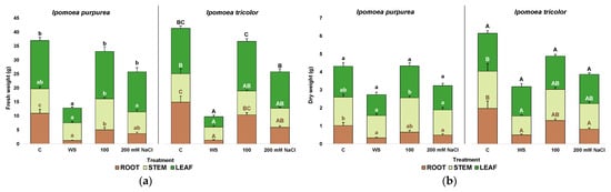 Figure 5. Fresh weight (a) and dry weight (b) of roots, stems and leaves after three weeks of treatment in the two Ipomoea species. The values plotted are the means ± SE (n = 5). Different lowercase and uppercase letters indicate significant differences between treatments, for each species, according to the Tukey post hoc test (p < 0.05).