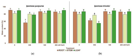 Figure 6. Water content in roots, stems, and leaves in I. purpurea (a) and I. tricolor (b) after three weeks of treatment in the two Ipomoea species. The values plotted are the means ± SE (n = 5). Different lowercase and uppercase letters indicate significant differences between treatments, for each species, according to the Tukey post hoc test (p < 0.05).