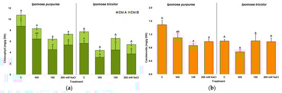 The highest concentration of leaf photosynthetic pigments was recorded in plants grown under control conditions. Chlorophyll values were higher in I. purpurea than in I. tricolor (8.74 and 5.35 mg/g DW), whereas chlorophyll b concentrations were similar (Figure 7a). Carotenoid concentrations were also higher in I. purpurea (1.5 mg/g DW) than in I. tricolor (1.0 mg/g DW) (Figure 7b). Salinity but no water stress had a negative effect on chlorophyll a and carotenoid concentrations in I. purpurea, whereas I. tricolor accumulated similar pigment concentrations under all growing conditions (Figure 5a,b). Chlorophyll b concentrations were constant for both species in all treatments.
