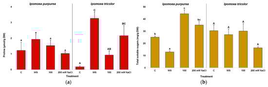 Figure 8. Proline (a) and total soluble sugars (b) after three weeks of treatment in the two Ipomoea species. The values plotted are the means ± SE (n = 5). Different lowercase and uppercase letters indicate significant differences between treatments, for each species, according to the Tukey post hoc test (p < 0.05).